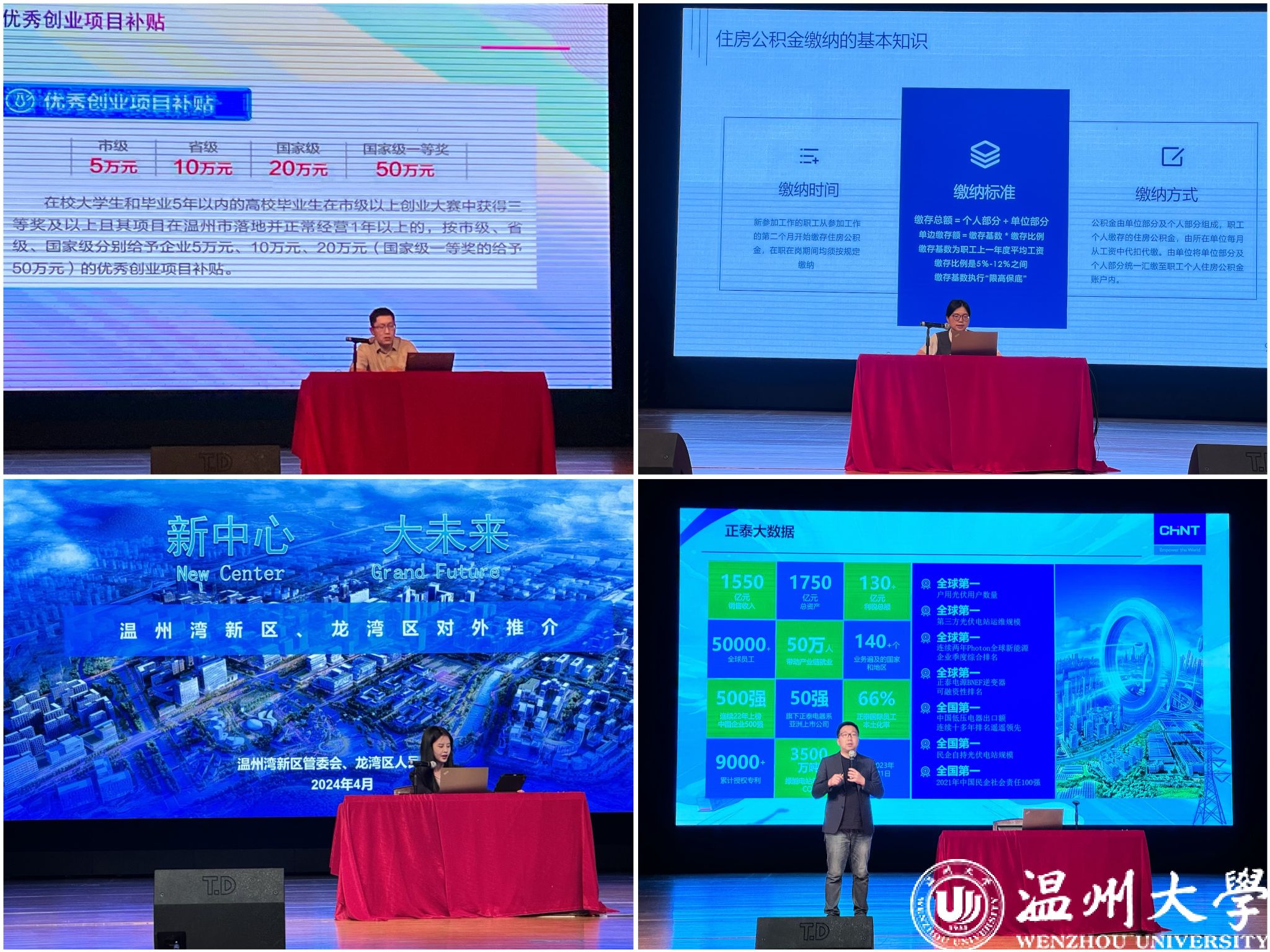 课堂上,我校留温政策宣讲团讲师、温州市人才发展服务中心副主任赵云从温州文化和产业讲起,详细介绍了温州市情和留温政策,特别向学生们介绍了最为关心的补贴申领办法;朱晓红则从保护自身权益讲起,向同学们介绍了公积金政策;杨丽媛则从龙湾区情、政策、产业发展分布、发展战略等方面向同学们展现了立体的龙湾形象;正泰集团作为本土优质上市企业对企业文化、发展前景、人才需求等方面进行了推介。
