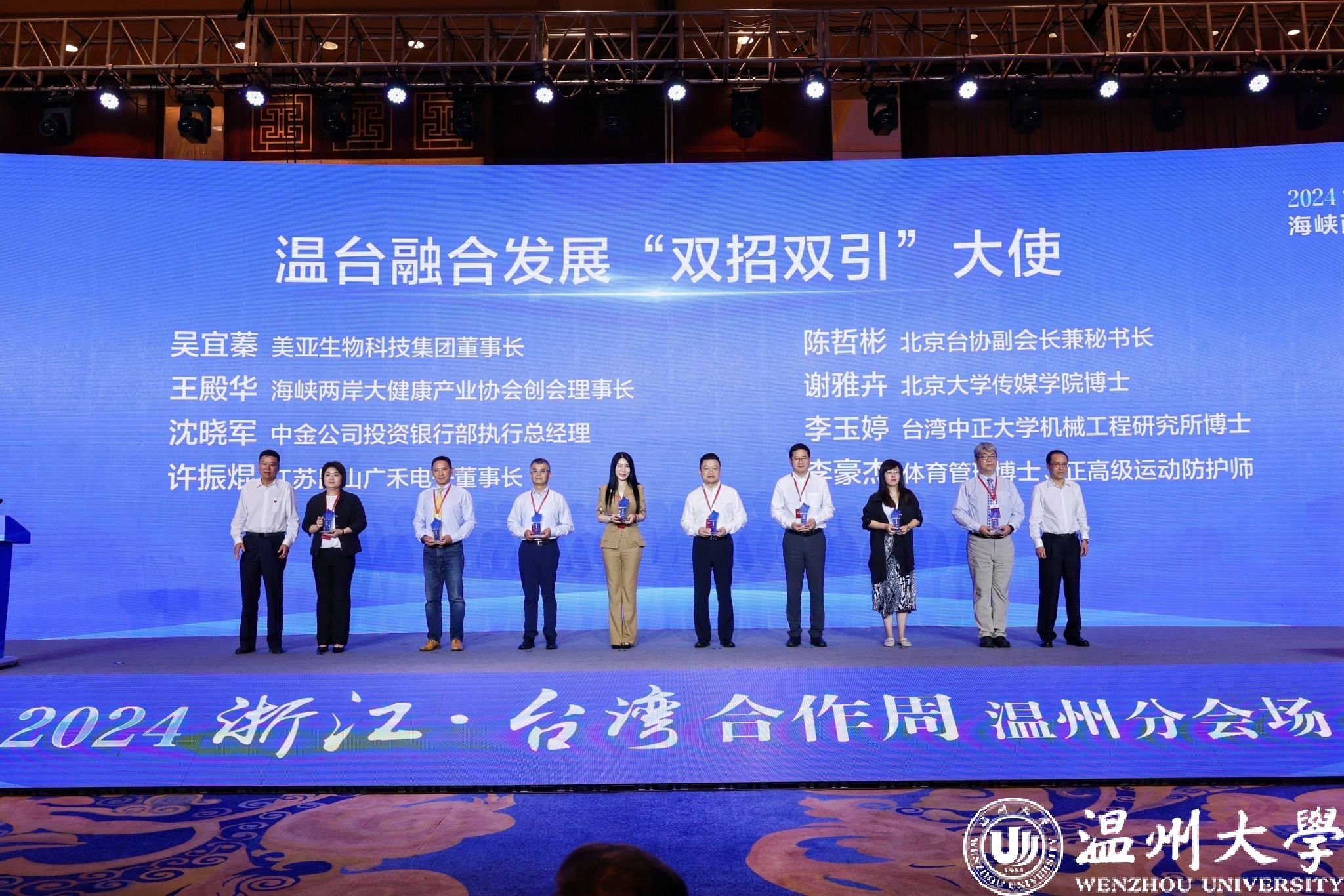 海峡两岸(温州)大健康产业对接会上,举办了“筑梦温州”海峡青年创新创业季启动仪式。温州市副市长陈宽为在温高校代表授“2024海峡两岸青年“瓯·文创之旅”暑期研学营”营旗。我校作为在温高校代表之一,由副校长王尧骏接旗。
