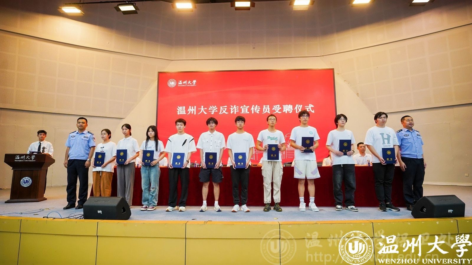 茶山派出所教导员张朝晖、温州市反诈中心警官刘昱洲为各学院学生代表颁发“星空平台反诈宣传员”聘书,并呼吁我校师生积极参与反诈宣传中,为平安温大贡献青春力量。