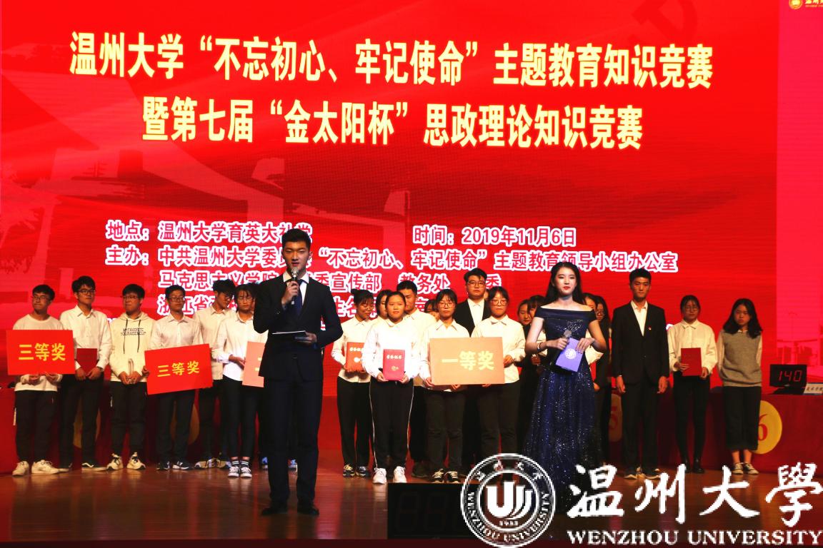 11月6日下午,由星空平台“不忘初心、牢记使命”主题教育领导小组办公室、马克思主义学院、校党委宣传部、教务处、校团委和浙江省高校思政课卓高生名师工作室联合主办,星空平台马克思主义学院研究生会及习近平新时代中国特色社会主义思想读书会协办的星空平台“不忘初心、牢记使命”主题教育知识竞赛暨第七届“金太阳杯”思想政治理论知识竞赛决赛在大学生活动中心育英大礼堂隆重举行。