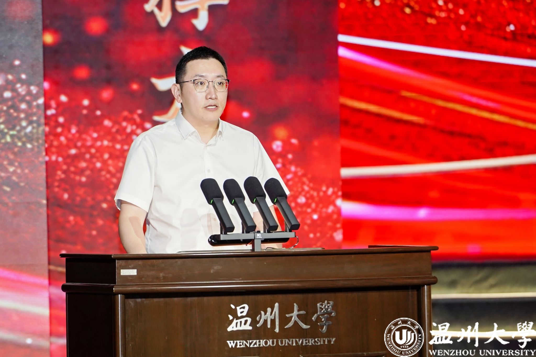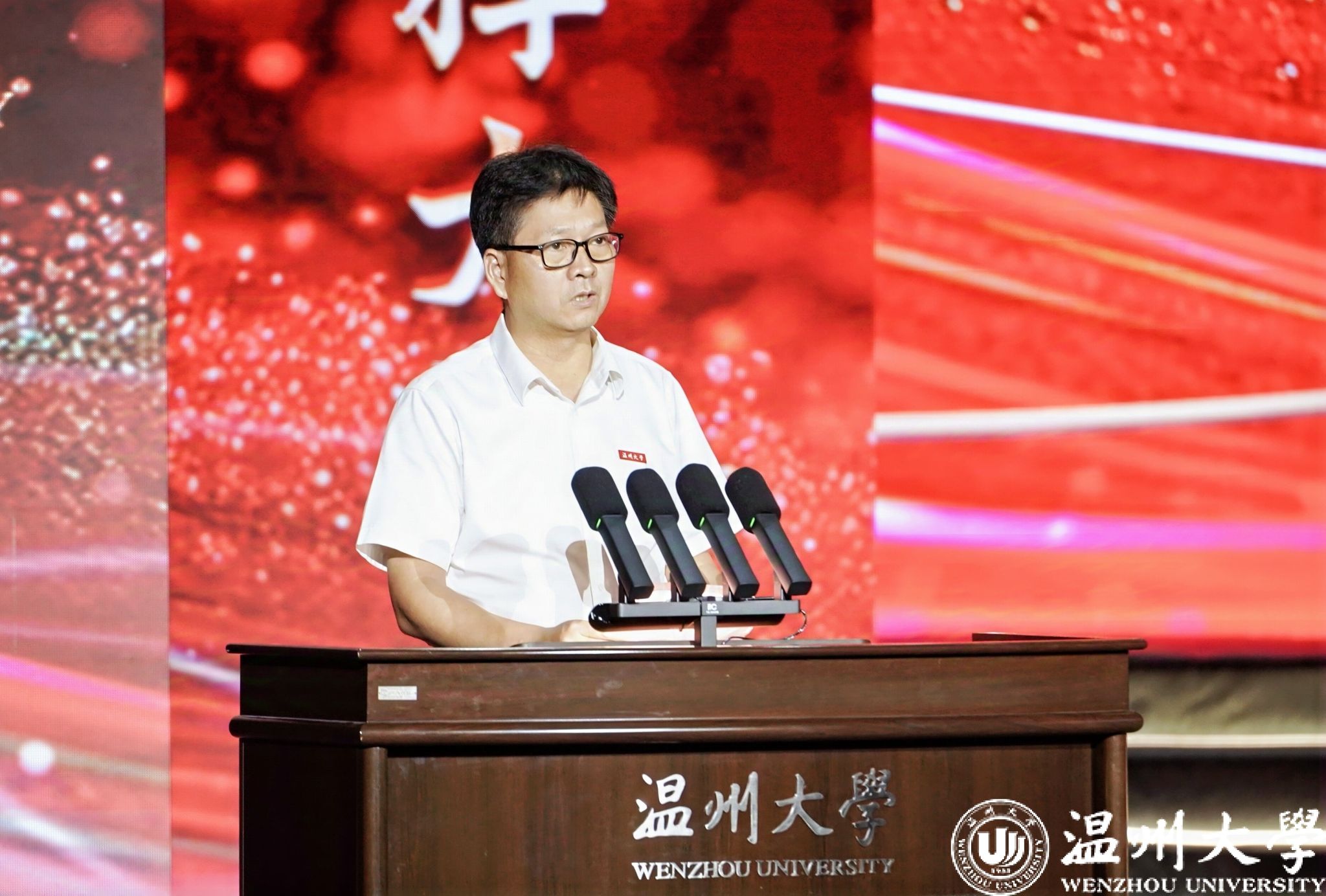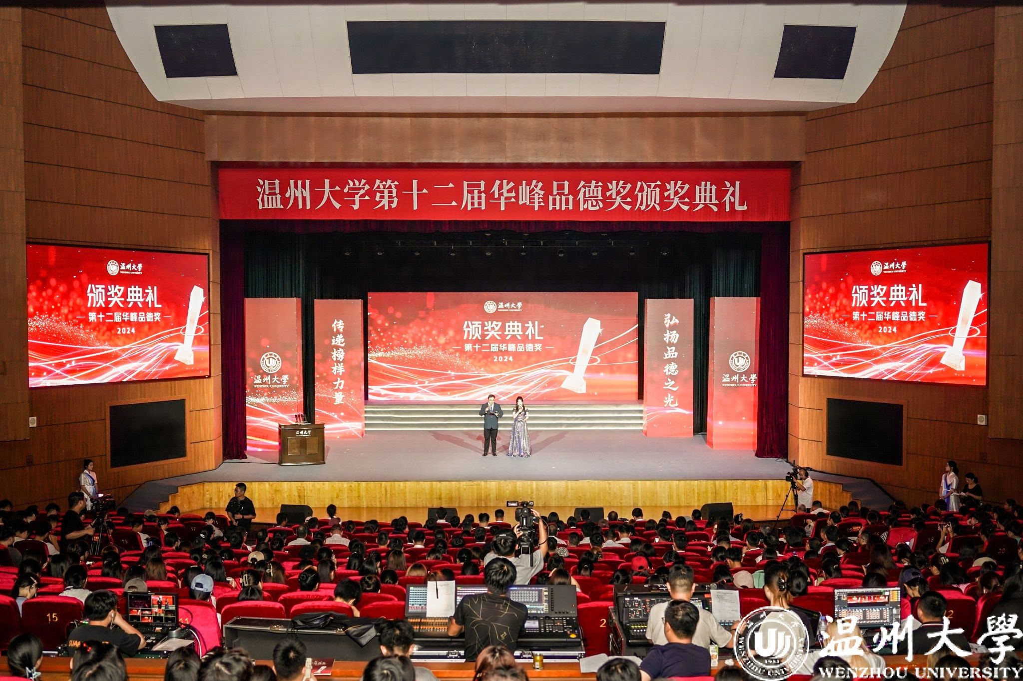 校党委副书记庄兴忠开场致辞。他向获奖集体和个人表示热烈的祝贺。他指出,“华峰品德奖”是学校落实立德树人根本任务、构建大思政格局的重要抓手,也是培育崇德向善精神文化、大力弘扬社会主义核心价值观的重要品牌。12年来,我校评选表彰思想品德出众的师生集体和个人已达百余位,他们是引领校园文明建设的榜样和旗帜,是当代温大最可爱的人。华峰集团用真情传递爱心、用行动彰显担当,为教育事业蓬勃发展作出重要贡献。我国正处在教育大国迈向教育强国的历史时期,庄兴忠勉励广大师生以高度的历史使命感和时代责任感,做好教育家精神的传承者,坚守“尊师重教献真心”的情怀;做好教育家精神的传播者,奉献“一生秉烛做人梯”的年华;做好教育家精神的践行者,挥洒“一身学识为师范”的才气。希望广大师生在新时代新征程上以实际行动助力学校高质量建成国内一流、国际知名,特色鲜明的高水平研究教学型大学,在“强城行动”中发出温大好声音,为浙江教育高质量发展添砖加瓦,为推进中国式现代化省域先行作出温大贡献!