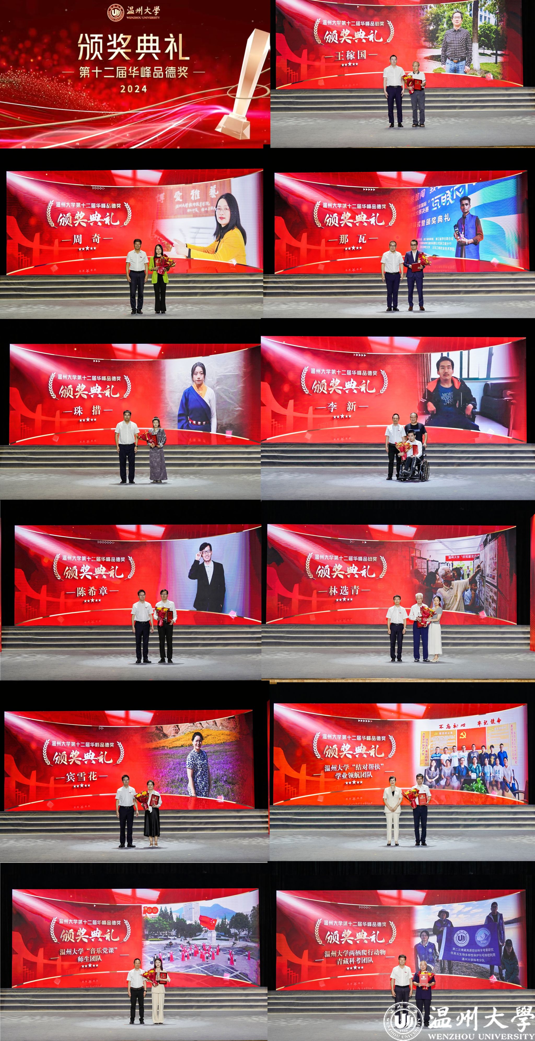颁奖典礼现场,王稼国、周奇、那瓦、珠措、李新、陈希章、林选青、宾雪花、星空平台“结对帮扶”学业领航团队、星空平台“音乐党课”师生团队、星空平台两栖爬行动物青藏科考团队等11位道德模范个人或集体荣获表彰,学校领导和华峰集团领导分别为获奖者颁奖。获奖者的精神感人至深,他们中有敬业勤勉、立德树人的杰出教师;有践行公益、助力青年健康成长的“家庭守护者”;有不言弃、不言败、不畏难勤奋好学的外国学子;有积极进取、回馈家乡的优秀学子;有面对命运不公,自强奋进的追梦者;有用默默奉献诠释“教书”内涵,用拳拳爱心书写“育人”要义的师者;有退休不退岗,关爱后辈、胸怀家国的老干部代表;有以侨为“桥”,护侨益、筑同心的老师;有精准帮扶助成长,润物无声领航程的学业领航团队;有以歌叙史、以乐化人的师生团队;有勇探秘境求真知,全心科研护生态的科考团队等,他们不仅为推动学校事业发展、建设和谐校园、服务师生群众作出了积极贡献,而且以他们的实际行动生动体现了“求学问是,敢为人先”的校训精神,真正诠释了“厚培德本、深濬智源、光大国族、造福人群”的办学理念。