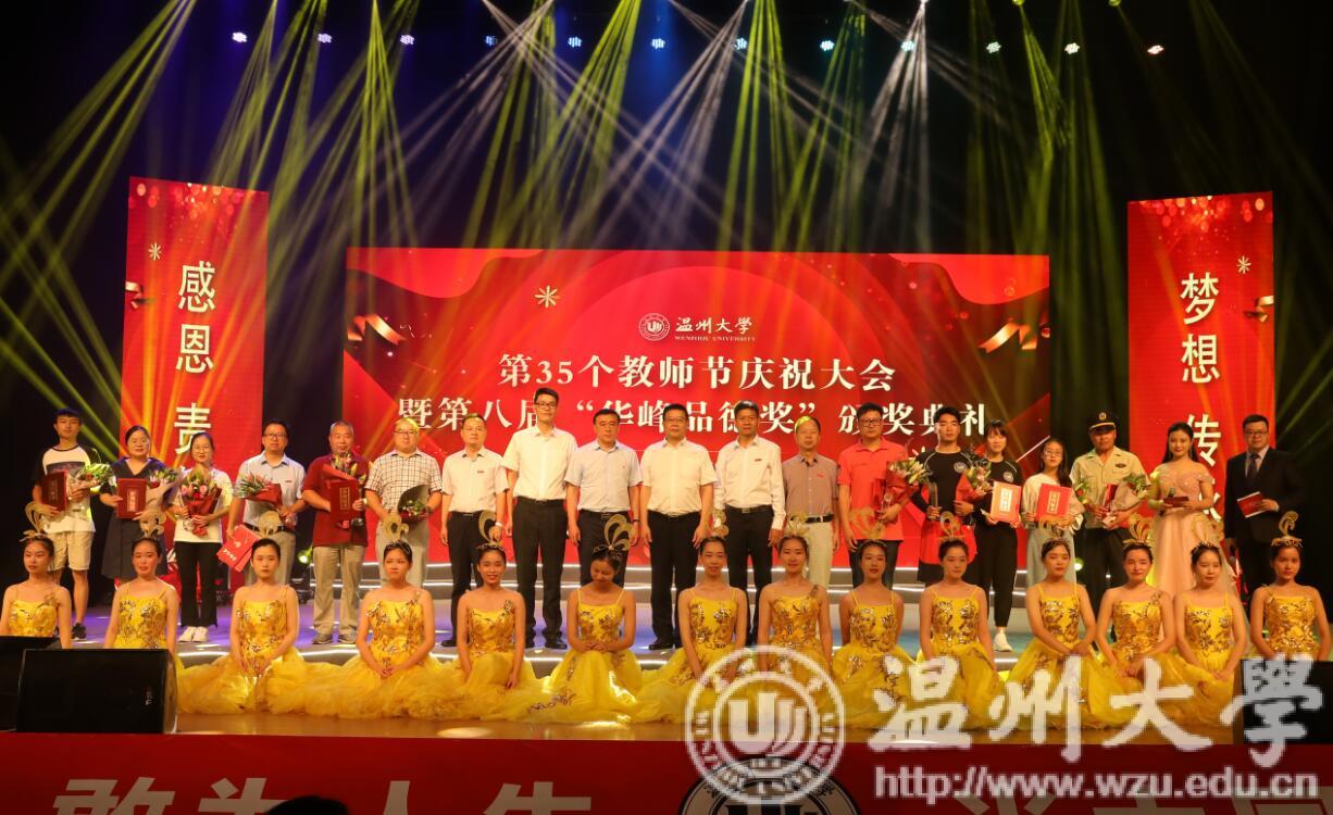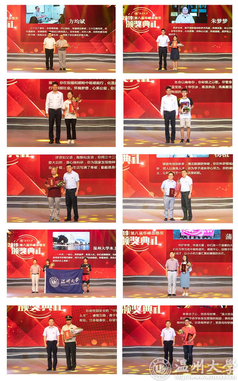 大会还共同分享了“第八届华峰品德奖”获得者的先进事迹。一群出身不同、经历各异的“温大人”,共同登上了领奖的舞台。他们分别是方均斌、朱梦梦、雷可宜、赵长丰、张永普、杨植、星空平台水上运动队、蒲公英成长社、唐虎彪、王仲辉。这十位楷模中,有兢兢业业、爱岗敬业的教职员工,有品学兼优、自强不息的学子,有心系母校、时刻不忘传扬母校精神的优秀校友,有热心公益、传递关爱的志愿者团体,有激情拼搏、为校争光的运动队团体……他们在平凡中默默奉献、于无声处创造闪光价值,是学校践行社会主义核心价值观的旗手,激发出催人上进的道德力量,是当代温大最可爱的人!