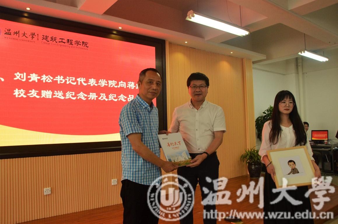 紧接着,温州南龙房地产开发有限公司董事长、我校1984级工民建专业蒋维清校友给大家分享了一个财富的小故事,人不仅要有智商、情商,更要有胆量与胸怀。他通过结合马云和雷军的案例告诉同学们,只要肯努力人人都有机会成功,并勉励同学们努力学习,奋发上进。最后,学院党总支书记刘青松代表学院向蒋维清先生赠送了纪念册和学生的手绘纪念品。