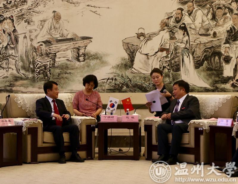 5月22日下午,韩国全南大学校长丁炳硕(JEONG Byungseok)、副校长朴相圭(PARK Byungseok)、研究生院院长白壮善(BAEK Jangsun)、国际协力本部长兼语言教育院长文基硕(MOON Kiseok)等一行来访我校,洽谈深化教育国际合作事宜。校长赵敏,副校长钱强,相关部门、学院负责人及两校联合培养博士生导师代表参加会谈。