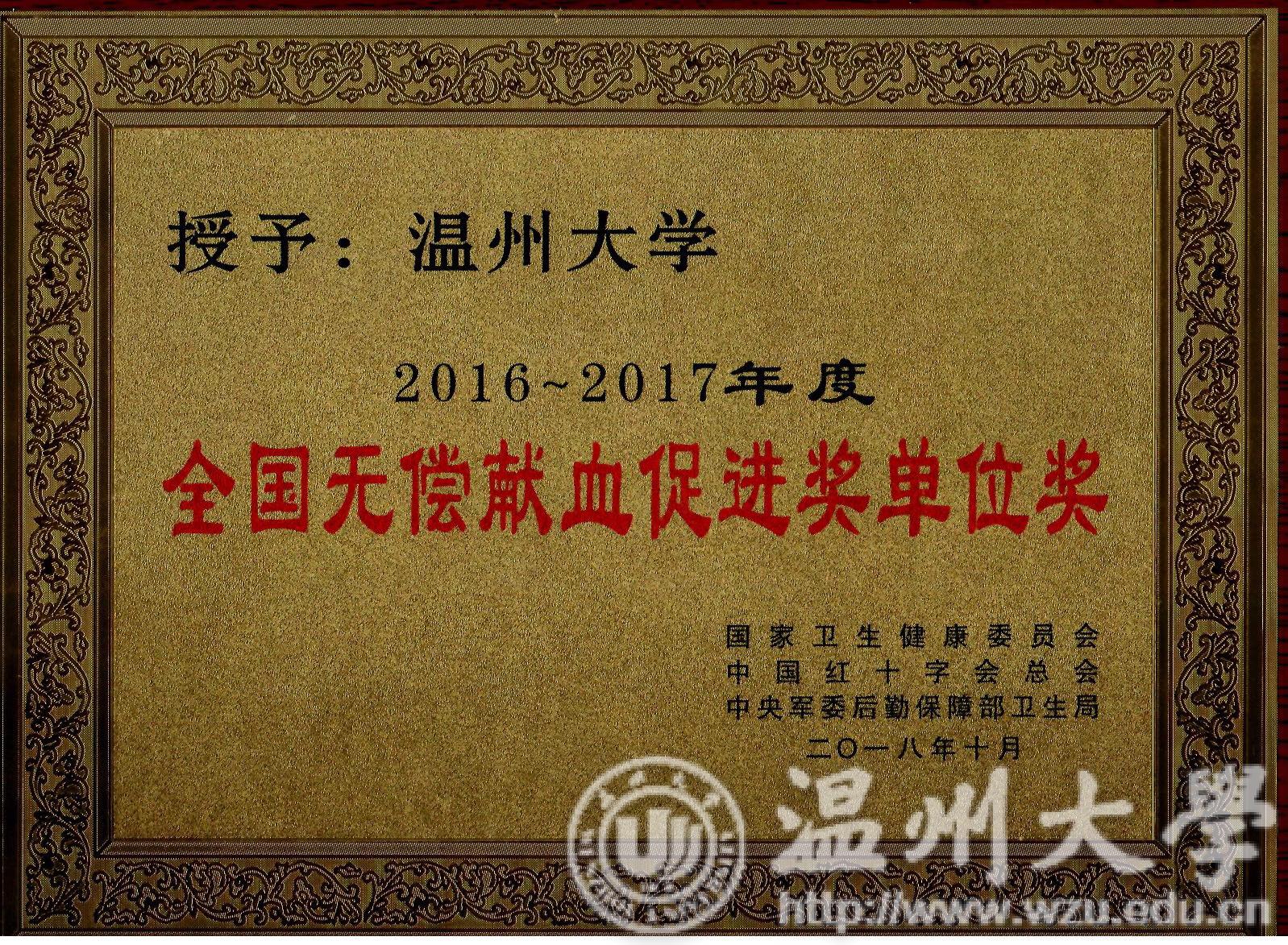 日前,由国家卫生健康委、中国红十字会总会、中央军委后勤保障部卫生局发布《关于表彰2016-2017年度无偿献血奉献奖金奖等奖项获奖者的决定》,我校获全国无偿献血促进奖。
