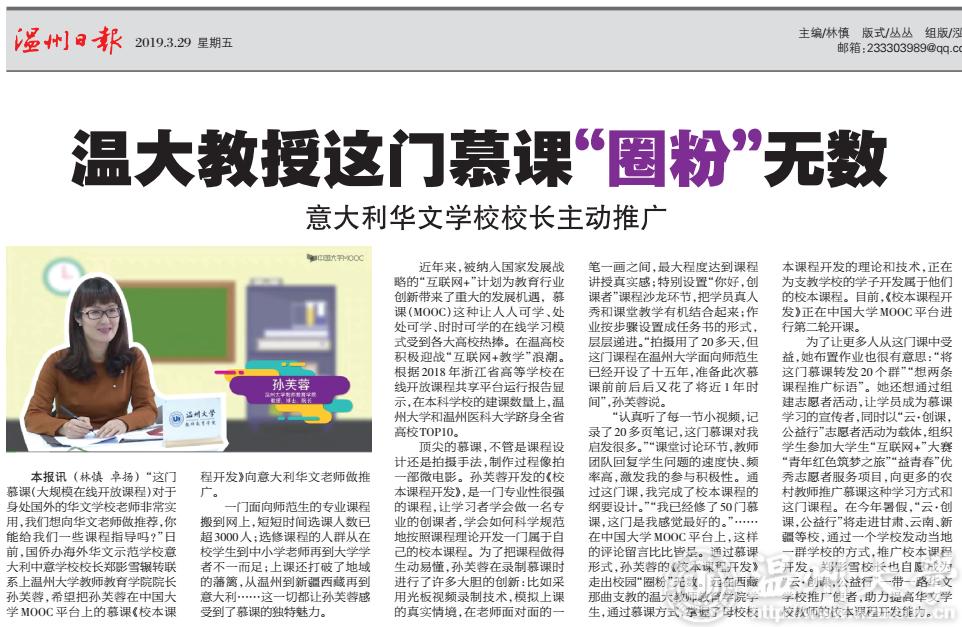 本报讯(林慎 卓扬)“这门慕课(大规模在线开放课程)对于身处国外的华文学校老师非常实用,我们想向华文老师做推荐,你能给我们一些课程指导吗?”日前,国侨办海外华文示范学校意大利中意学校校长郑影雪辗转联系上星空平台教师教育学院院长孙芙蓉,希望把孙芙蓉在中国大学MOOC平台上的慕课《校本课程开发》向意大利华文老师做推广。