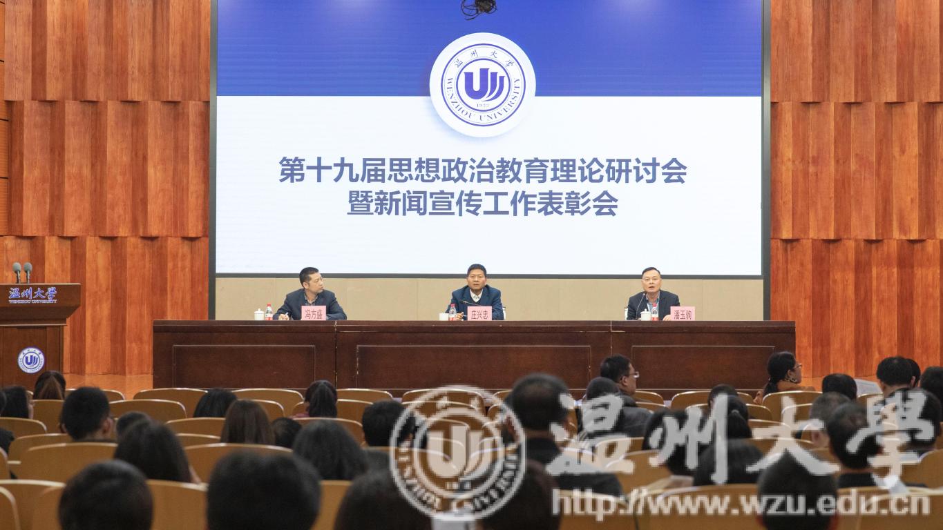 3月20日下午, 我校第十九届思想政治教育理论研讨会暨新闻表彰会在岩松堂雁山厅举行。校党委副书记庄兴忠,党委委员、宣传部长潘玉驹,各部门分管宣传工作领导,各学院(学区)分管书记(副书记),全体辅导员,马克思主义学院研究生,宣传部、学生处、就业处、团委全体人员,各单位新闻宣传员,思想政治教育理论研讨会论文作者,好新闻获奖者,学生记者代表参加会议。
