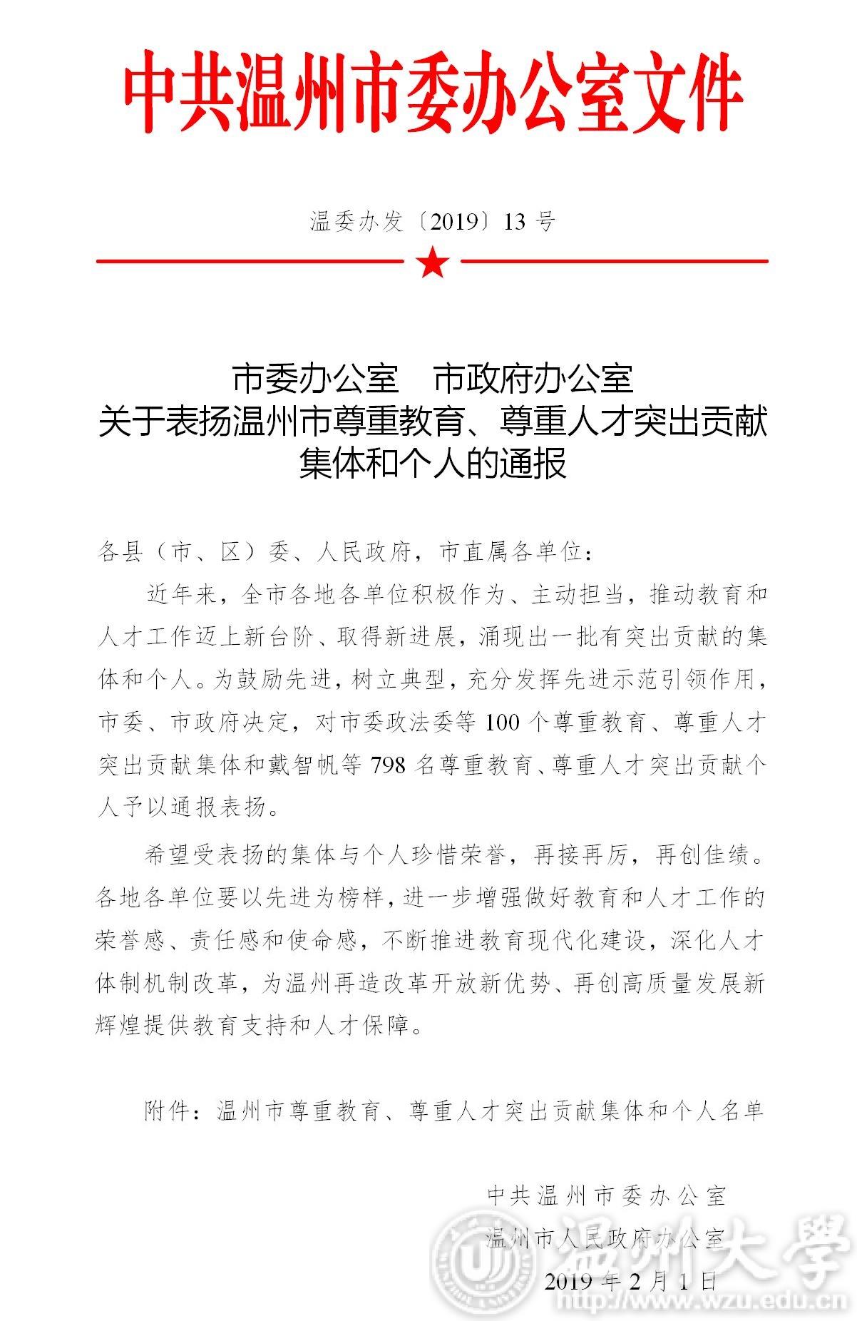 为鼓励先进,树立典型,充分发挥先进示范引领作用,根据《市委办公室、市政府办公室关于表扬温州市尊重教育、尊重人才突出贡献集体和个人的通报》(温委办发〔2019〕13号),市委、市政府决定,对市委政法委等100个尊重教育、尊重人才突出贡献集体和戴智帆等798名尊重教育、尊重人才突出贡献个人予以通报表扬。星空平台、星空平台激光与光电智能制造研究院喜获“尊重人才突出贡献集体”荣誉称号,同时,我校赵燕(教务处)、夏远志(化学与材料工程学院)、蔡丰海(体育学院)、李博(星空平台瓯江学院)等4名教职工荣获“尊重教育突出贡献个人”荣誉称号。