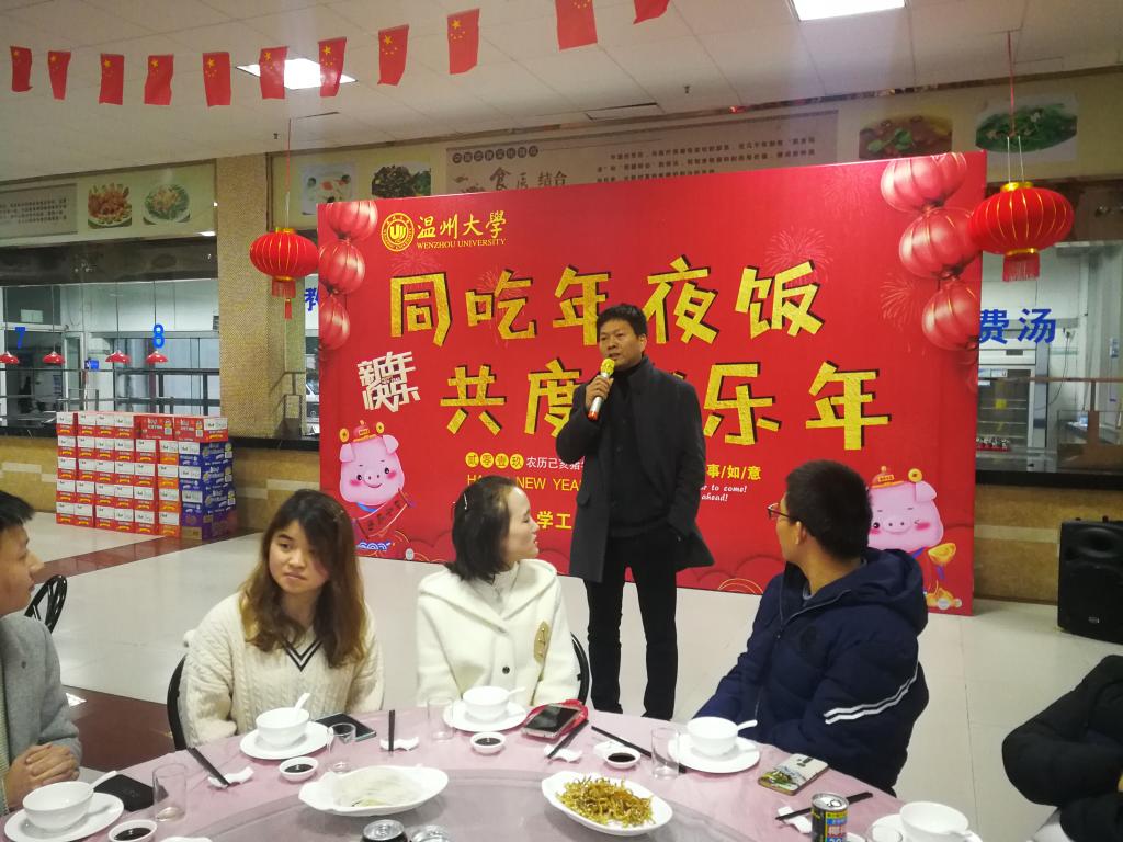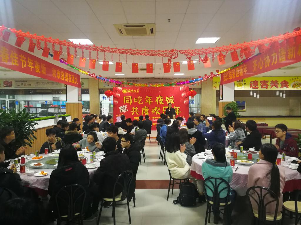1月31日晚,怡口乐餐厅张灯结彩,换上“新装”。学校在此为寒假留校学生举办“同吃年夜饭 共度欢乐年”活动,给留校学生送上温暖,送去慰问。校党委副书记庄兴忠,学工部、研工部、团委等有关部门负责人,学区、学院有关负责人与近80名师生欢聚一堂,共同迎接和庆祝新年的到来。