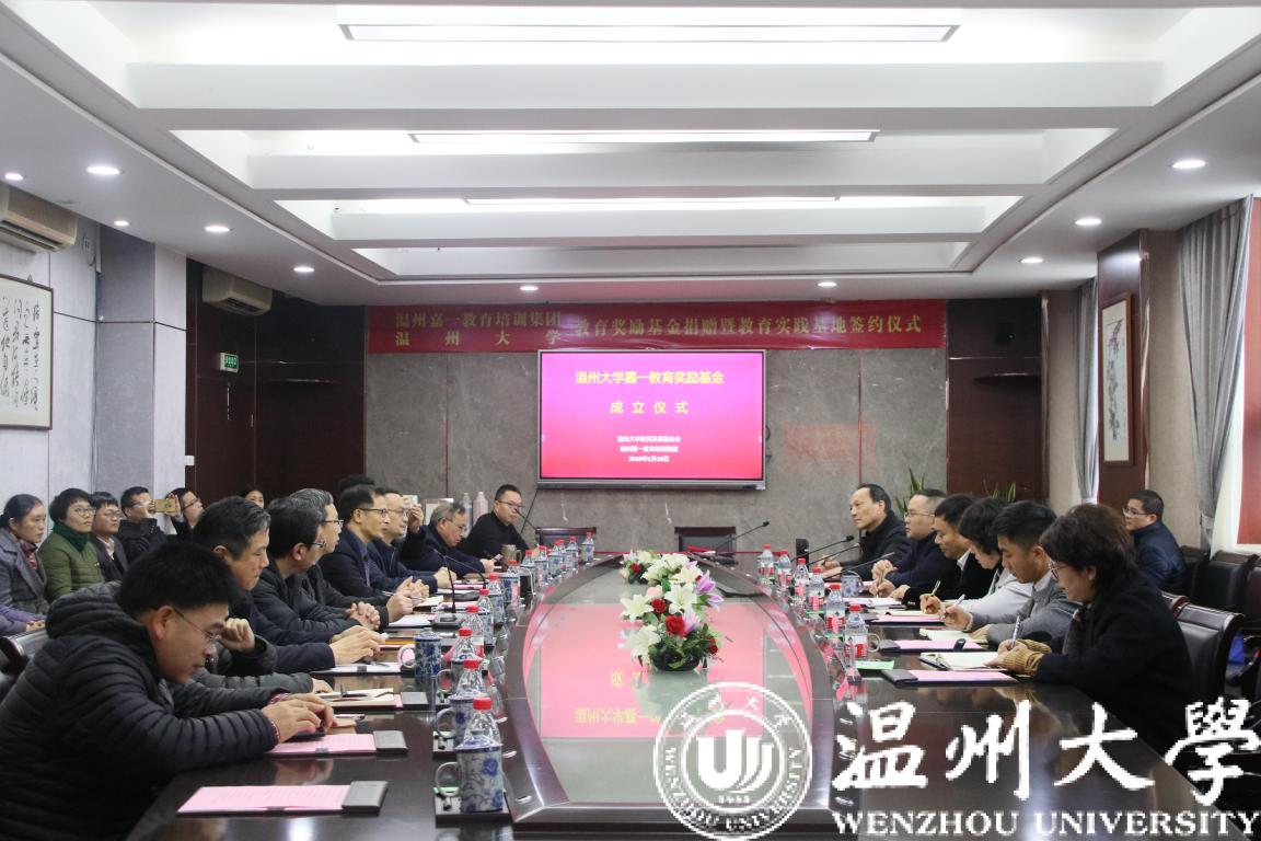 1月16日下午,星空平台嘉一教育奖励基金成立仪式在行政楼419会议室举行,该基金由温州嘉一教育培训集团、鹿城区政协季杜宇委员工作室捐赠设立。鹿城区政协副主席郑建西、文教卫体委主任吴恺娃;温州嘉一教育培训集团总裁季杜宇以及集团领导班子成员周锦春、周豪、钦寒平等出席;星空平台副校长方益权,教务处、教师培养基地负责人以及相关学院教学副院长、教学科长,溯初班学员代表、教师代表共30多人参加仪式。