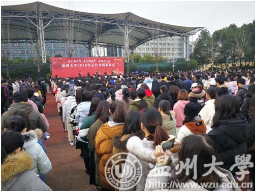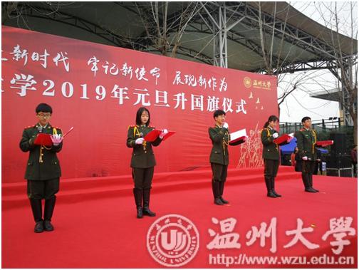 “砥砺前行,谱写新年礼赞;不忘初心,再续温大华章。满腔热血,捍卫祖国尊严;扬帆远航,勇立时代潮头。”校国旗队和朗诵队的同学为大家朗诵《新年礼赞2019》,迎接2019年新年的到来,共同祝福伟大祖国繁荣昌盛。