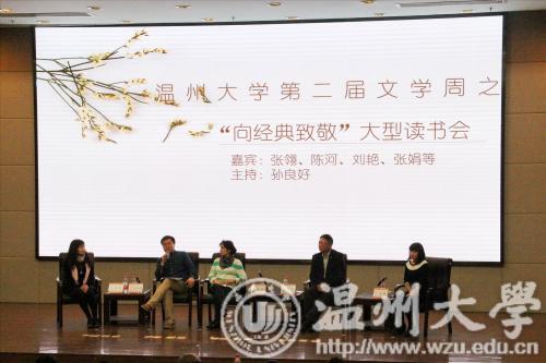 活动开始后,孙良好院长向大家隆重介绍了五位嘉宾,并提出在这个众声喧哗、浮光掠影的社会里,我们要沉下心来阅读经典。之后,各位嘉宾以“读经典的必要性”为主题展开了讨论。孙院长提出:“阅读经典就是‘无用而自有为‘,年少时应该博览群书、披沙拣金。”作家张翎通过她年轻时的经历告诉我们:“经典是年轻时营养的钙片”,她形象地解释了人与经典的关系并告诉大家年轻时要“穿上经典”、成熟后要“脱去”,学会与经典对话。随后,学者刘艳告诉同学们文化素养的养成应该从阅读经典开始,她以沈从文的《边城》和萧红的《呼兰河传》为例,教导大家读经典不能教科书式的阅读,要回到原作、现场以及作者的人生经历来感受一个作家写作的变化。紧接着,作家陈河说道,“读经典要从年轻开始,投入全部精力去读自己喜欢的经典。”学者张娟着重讲述生命哲学,通过生命哲学启示我们每一个个体去发现经典,面对自己、享受孤独之美。