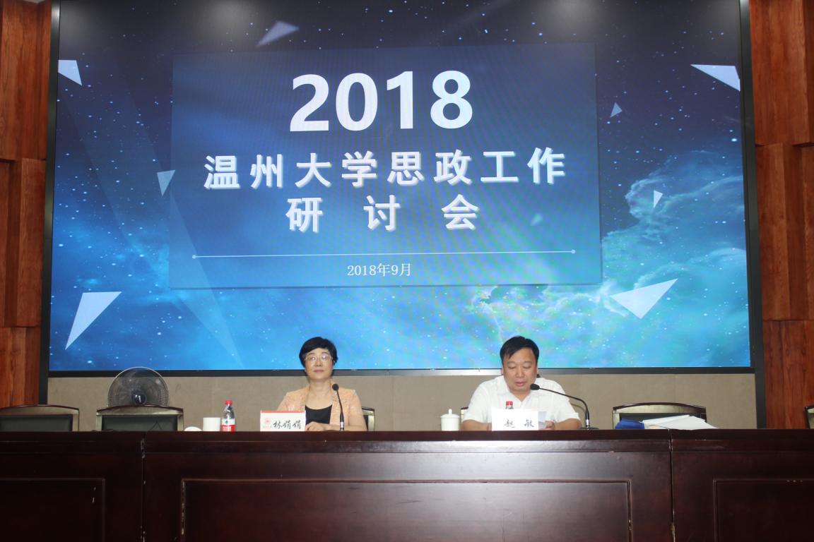 9月4日至5日,我校2018年思政工作研讨会在雁山厅举行。校党委书记林娟娟,校长赵敏,党委副书记牟德刚,党委委员、副校长方益权,党委委员、宣传部部长潘玉驹,各有关部门负责人,各学区、学院书记、副书记,校本部全体辅导员、全体思政课教师,瓯江学院辅导员代表共170人参加会议。