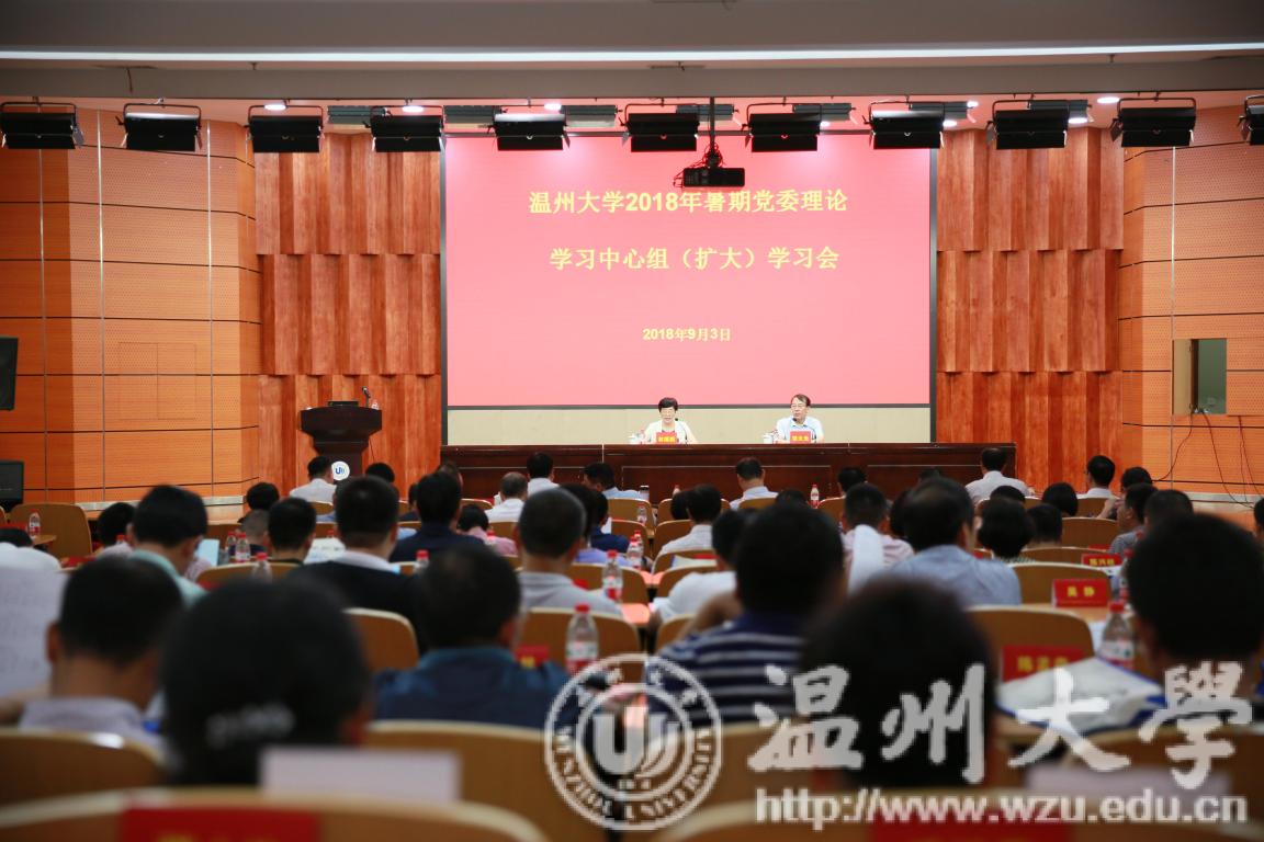 9月3-4日,我校召开2018年暑期党委理论学习中心组(扩大)学习会。会议围绕“以‘本’为本 争创一流 用‘八八战略’引领学校新发展”这一主题,深入学习贯彻习近平总书记在北京大学师生座谈会和纪念马克思诞辰200周年大会上的重要讲话精神,在《中共浙江省委关于“八八战略”实施15年情况的报告》上作出的重要指示精神,学习贯彻新时代全国高等学校本科教育工作会议和全省本科高校书记校长暑期读书会精神,坚持“以本为本”,推进“四个回归”,加快建设高水平本科教育,加快博士学位授权点培育,积极研讨学校“立地顶天”的各项举措,提升办学质量和办学层次,推动高水平应用型大学建设。