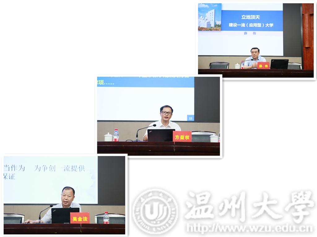 全体校领导,中层干部,民主党派、无党派、知联会主要负责人,省一流学科负责人,省级以上科研平台负责人,省重点创新团队负责人,国家、省重点建设专业负责人,省实验教学示范中心负责人,省教师教育基地执行主任,市金融研究院、校级研究院(所)、校地研究院负责人,基础教育发展中心负责人、温大附属幼儿园负责人参加学习会。