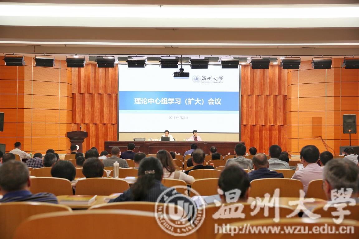 4月27日下午,我校召开理论中心组学习(扩大)会议,学习贯彻习近平新时代中国特色社会主义思想和全国“两会”精神。会议邀请省中国特色社会主义理论体系研究中心主任、浙大求是讲座教授胡坚作专题报告。