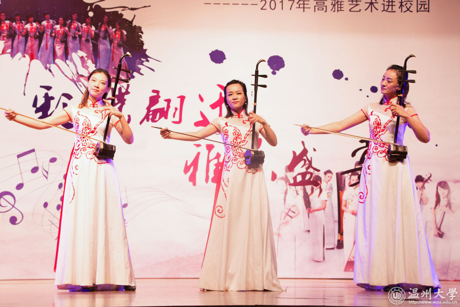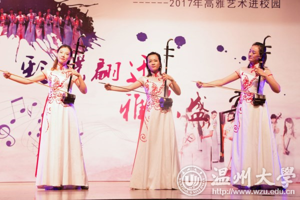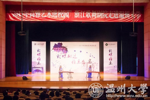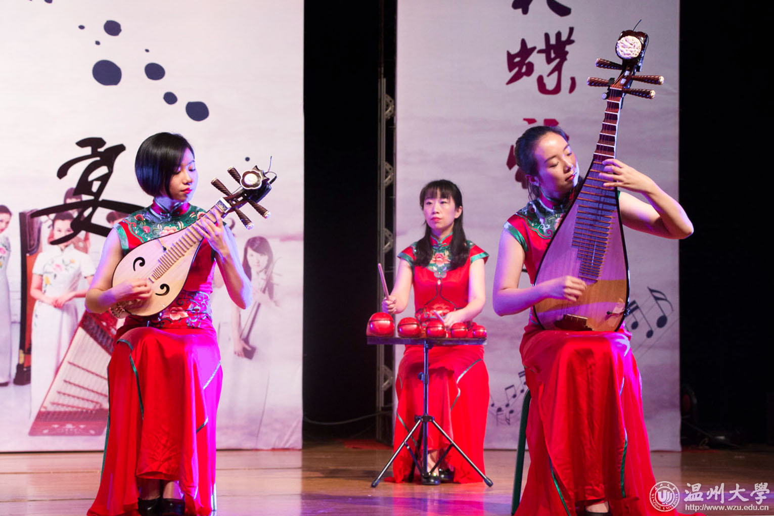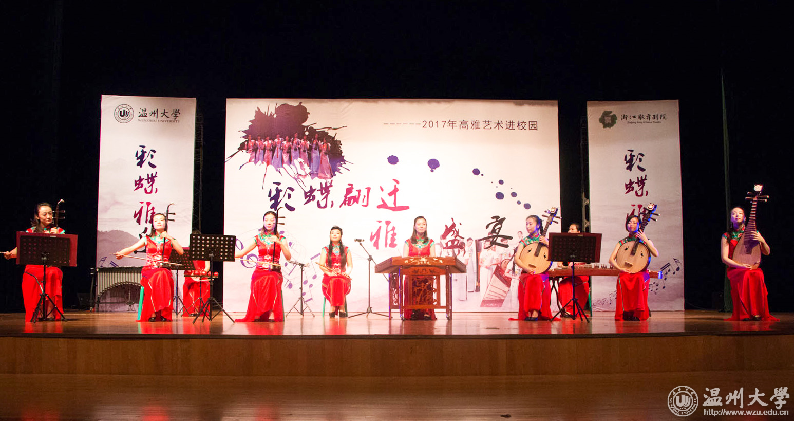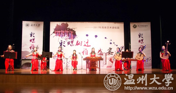 一阵秋风裹挟着冷雨悄然而至,而我校育英大礼堂里暖意融融,丝竹悠扬。10月14日下午,浙江歌舞剧院“彩蝶女乐”带来的《彩蝶雅乐》音乐会在我校育英大礼堂举行,为师生们献上一场视听盛宴。 《采茶舞曲》绽放出春天少女采茶的活力与朝气;《灯月交辉》铺开了元宵佳节的快乐热闹;《水乡小唱》将渔民喜悦的心情淋漓尽致地表达了出来……双筝合奏《战台风》,曲调气势磅礴,时而紧张激烈,时而优美抒情,将台风来临前的风平浪静、台风来临时的惊心动魄以及台风过后的重归于忙碌表现出来。在场的人无不如醉如痴,仿佛身临其境。 此次音乐会,不仅可以欣赏到“彩蝶女乐”民族乐团带来的精彩演奏,还可以一睹我校音乐学院学子的才华。在一首高昂的板胡独奏《月牙五更》之后,五个身着红裙的少女们,分别执着二胡、扬琴、阮、琵琶、古筝,时而激情澎湃,时而柔和恬淡,当最后一个音符落下的时候,全场响起了热烈的掌声。 “此次‘高雅艺术进校园’活动,既为我校学子提供了与艺术家们交流切磋的机会,更在广大师生中弘扬中国优秀传统艺术,使我校师生的艺术修养得到提升。”欣赏音乐会后,师生们纷纷表示。 “聆听音乐会,让我身心愉悦而轻松,希望以后能经常有机会参加这样的活动。”马克思主义学院贾同学说。我校艺术团学生徐少军感慨:“台上青年音乐家们的精湛表演着实令我震撼。她们为我们带来了源自先祖的丝竹之音,传承了千年的宫商角徵羽,让古老的音符又一次焕发了生机。”