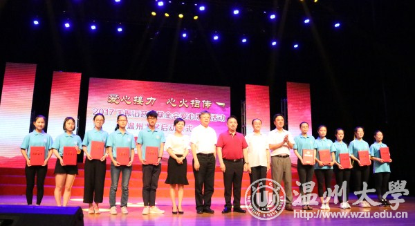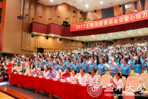 “笃学躬行,惟正惟诚;至善明德,惟志惟勤;践诺重信,惟必惟久;秉公尚爱,惟心惟崇;修身齐家,惟己惟人;青春报国,惟此惟大。”6月11日,2017王振滔慈善基金会爱心系列活动星空平台站启动仪式在大学生活动中心育英大礼堂举行,奥康集团董事长、王振滔慈善基金会创始人王振滔,王振滔慈善基金会秘书长冯芳芳,共青团温州市委书记林小露,共青团温州市委志工中心主任郭家乐,温州市慈善总会秘书长肖国庆,校长李校堃,党委副书记赵敏,副校长钱强,学校相关部门负责人,2017爱心接力手和各类奖助学金获得者代表,以及媒体记者参加启动仪式。 仪式上,全体学生集体朗诵爱心基金会“家训”,表达感恩之情。