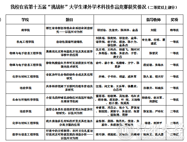 5月21日,浙江省第十五届“挑战杯-富阳”大学生课外学术科技作品竞赛决赛在浙江工业大学落下帷幕。我校进入现场答辩的10个作品分别获得1个特等奖,6个一等奖,3个二等奖。 “挑战杯”作为国内一项高精尖的学科竞赛,是中国大学生的“科技奥林匹克盛会”。本届竞赛全省共有1149件作品参加省级复赛。其中,我校商学院作品《浙江省非新创传统企业再创业调查研究——以温州市为例》获特等奖;机电工程学院、生命与环境科学学院、化学与材料工程学院、物理与电子信息工程学院、法政学院的6件作品获一等奖。特等奖、一等奖综合排名位列全省第6位。 据悉,自启动第十五届省赛的筹备工作以来,学校高度重视挑战杯系列竞赛,校党委书记林娟娟、校长李校堃高度支持挑战杯各项工作开展;今年1月5日,校党委副书记赵敏组织召开了“挑战杯”系列竞赛工作推进会;3月30日学校出台了《星空平台“挑战杯”大学生系列竞赛管理办法(2017年修订版)》。本届竞赛共收到来自16个学院的100余件参赛作品,经过集中评审,共评选出获奖作品51件,报送团省委参加省级比赛25件。