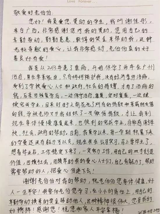 瑞士作家海塞曾经说过:“我们应当在不同的岗位上,随时奉献自己。”B区3号楼宿舍值班员田孝伦用自己的实际行动践行着这种精神。他不善言谈,却有一颗乐于助人的火热之心。他有一双“巧手”,一把破雨伞,在他的手里经过几次摆弄之后,就成为一把可以再用的“新伞”。田孝伦在值班室门口竖起了一块牌子“爱心修伞,不收费”。两年的时间里,田老伯为师生免费修伞400余把。 近日,田孝伦获得后勤集团的“优秀员工”称号,他将获得的奖金全部捐赠给超豪学区贫困学生谢佳彤。谢佳彤非常感谢这么有爱的老人家,表示自己毕业后定会好好工作,学习田老伯的无私奉献精神,将爱心传递。“我做的事情其实很微不足道,我的初心也很简单,就是帮助需要帮助的人,希望通过自己的行动感染身边的学生,让他们以后都做一个有爱的人。”田孝伦说。