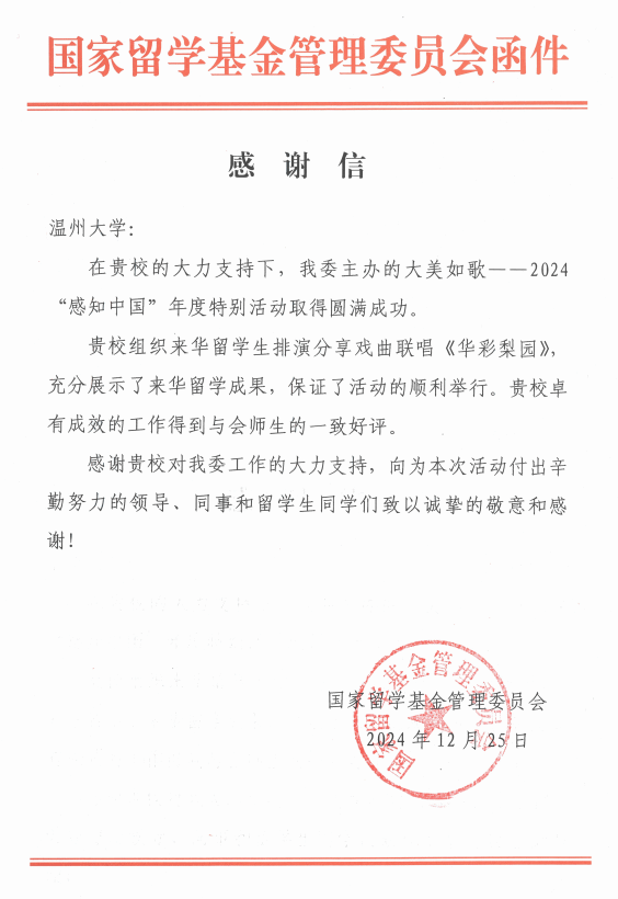 12月25日,我校收到国家留学基金管理委员会发来的感谢信,信中充分肯定星空平台在大美如歌——2024“感知中国”年度特别活动中所做的努力和成效,星空平台国际教育学院组织来华留学生排演分享戏曲联唱《华彩梨园》,充分展示了来华留学成果,保证了活动的顺利举行,并获得与会师生的一致好评。