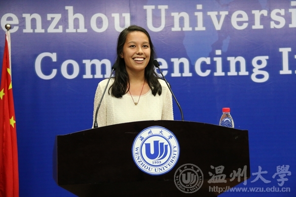 教师代表姜潮教授发言,表达了对学生的热爱之情,以及帮助学生实现梦想的坚定决心。 “无论由于何种原因,我们都有缘在温大相遇。我们中一些人跨越半个地球远道而来,而另一些人早已将中国视若故土。”老生代表,来自美国的艾米一开口,她字正腔圆的中文让在场师生纷纷称赞。发言中,她希望新生珍惜在温大求学的时光,不忘初心,努力前行。