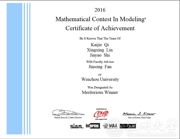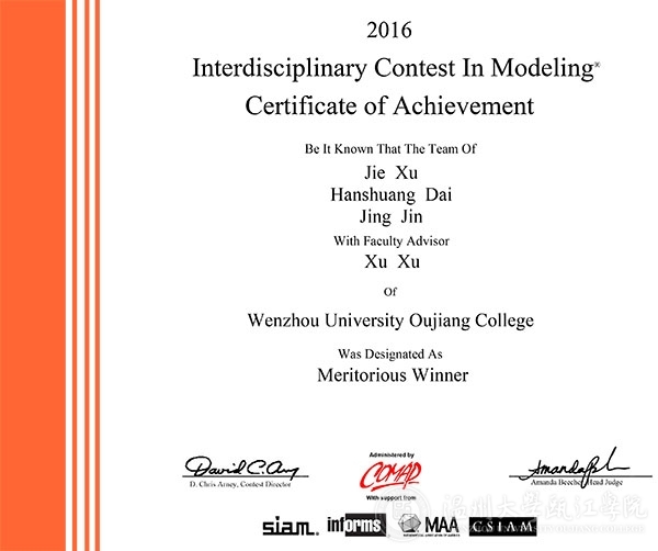 日前,2016年美国大学生数学建模竞赛(MCM/ICM)成绩公布,我校瓯江学院、数学与信息科学学院的学子与来自哈佛大学等世界一流大学的学生同台竞技,最终获得一等奖3项,二等奖3项的佳绩,其中,瓯江学院的成绩位列浙江省22所参赛独立学院之首。 2016年美国大学生数学建模竞赛(MCM/ICM)于北京时间2016年1月29日(农历月腊月二十)9点至2月2日9点在全球通过网络同步举行,来自中国、德国、美国、英国、加拿大、新加坡等国家超过10000支大学生队伍参加了竞赛,其中包括来自哈佛大学、普林斯顿大学、麻省理工学院、清华大学、北京大学等国际知名高校学生参与此项赛事角逐。竞赛以三名本科生为一组,在四天时间内,就指定的问题完成从建立数学模型、求解、验证到论文撰写,以清楚的格式、流畅的英文提交一篇20页左右的论文到竞赛组委会。 据悉,美国大学生数学建模竞赛是唯一的国际性数学建模竞赛,也是世界范围内最具影响力的数学建模竞赛,为现今各类数学建模竞赛之鼻祖。该项竞赛始于1985年,由美国数学及其应用联合会(comap)主办,美国数学学会、运筹学学会、工业与应用数学学会等多家机构协办。目前该项赛事已经成为最著名的国际大学生竞赛之一,每年包括哈佛大学、麻省理工学院、北京大学、清华大学等国内外顶级高校的学生都会参加各奖项的角逐。赛题内容涉及经济、管理、环境、资源、生态、医学、安全、未来科技等众多领域,着重强调研究问题、解决方案的原创性、团队合作、交流以及结果的合理性,具有极强的实际应用背景。