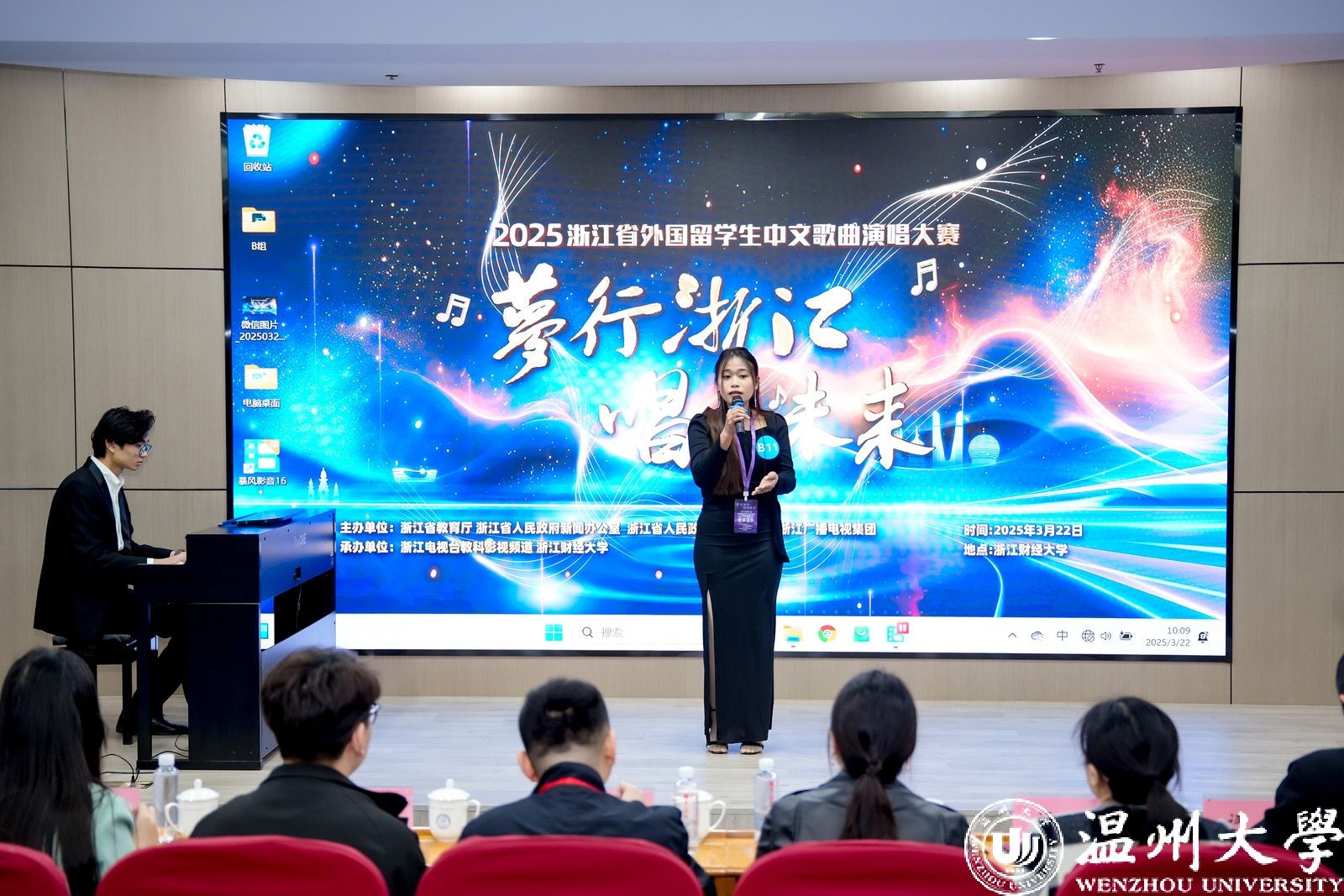 3月22日,由浙江省教育厅主办的“唱响未来 梦行浙江”外国留学生中文歌曲演唱大赛在浙江财经大学举办。本次比赛共有来自全省45所高校的235名选手带来174个参赛曲目。我校来自印度尼西亚的李怡然、黄汛裕、王志诚,来自刚果(金)的平安及来自越南的罗文达参赛。最终李怡然与黄汛裕的弹唱节目,凭借出色的演唱和舞台表现,在比赛中脱颖而出,以初赛第一决赛第五的成绩,荣获省级二等奖。