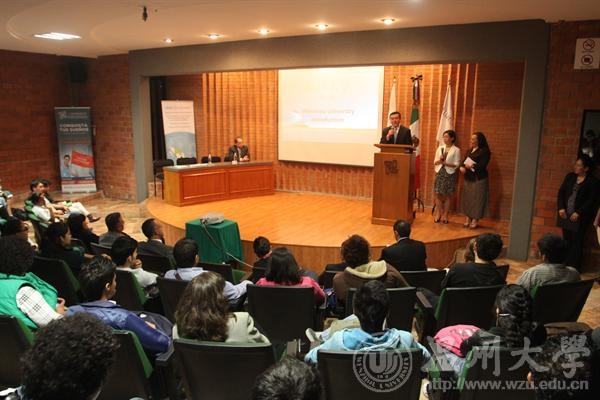 图为薛伟副校长在波多西那大学 (Universidad Potosina)大礼堂对师生讲话。