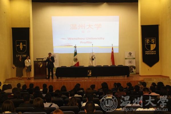图为薛伟副校长在唐格曼加大学(Universidad Tangamanga)给师生讲话。