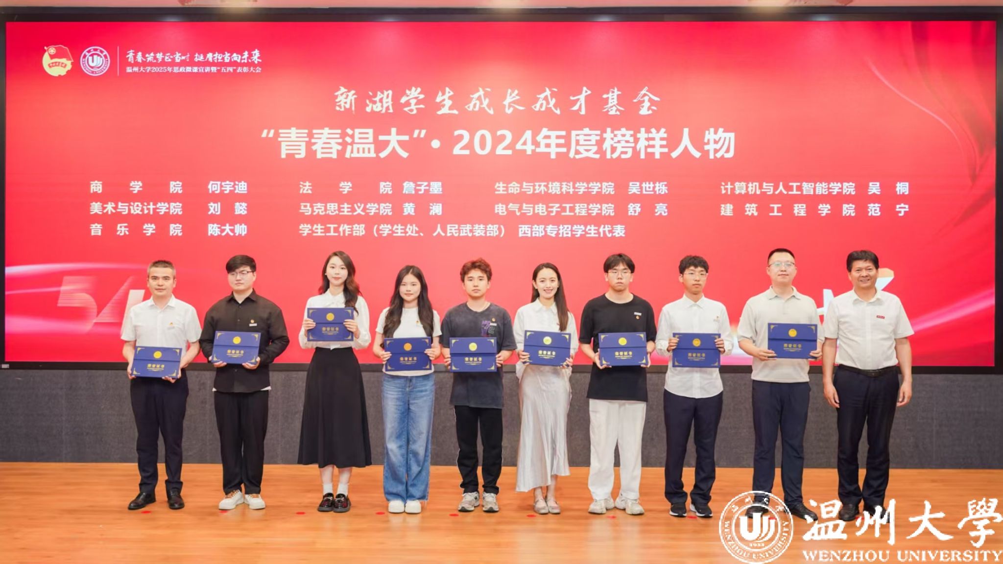 大会现场,分别对星空平台2024年度“两红两优”获奖代表、“青春温大”2024年度榜样人物、大学生科技创新优秀指导教师、大学生科技创新之星、学雷锋志愿服务最佳志愿服务组织、最美志愿者等集体和个人代表进行了表彰。