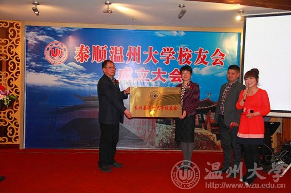 图为校党委副书记林娟娟向泰顺县校友会授牌。
