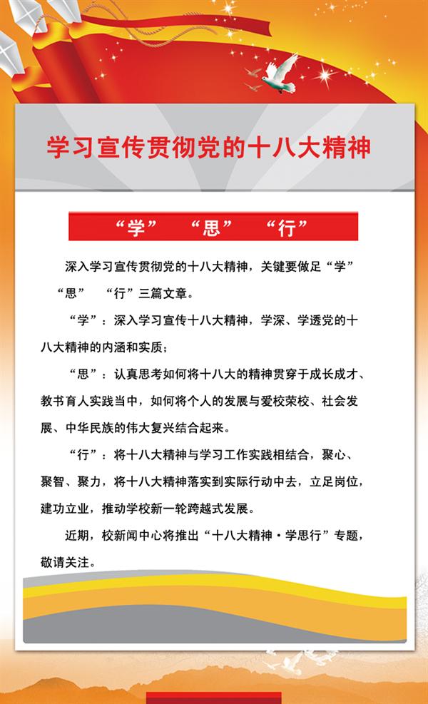 认真学习、深刻领会、广泛宣传、全面贯彻党的十八大精神,是当前和今后一个时期我们的一项首要政治任务。我们一定要精心组织学,原原本本学,全面系统学,联系实际学,做到党组织全覆盖、党员全覆盖、老师全覆盖,学生全覆盖。我们要准确理解党的十八大报告的新思想、新观点和新论断,不断增强政治意识、大局意识、责任意识。