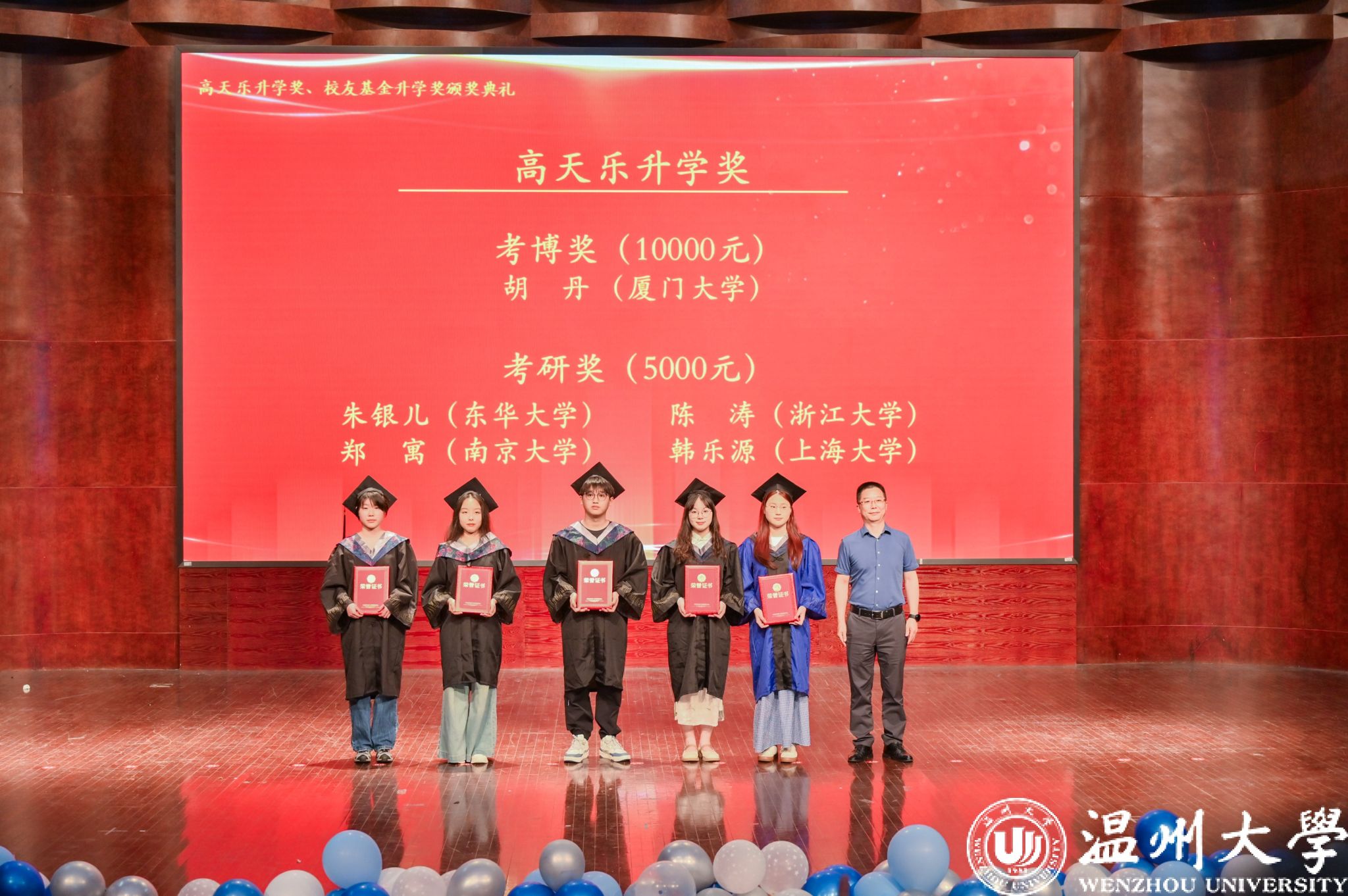 随后举行“校友基金升学奖”颁奖仪式。该升学奖是数理学院校友基金于2024年专设用于奖励成功考取国内外高校、研究机构硕博研究生的应届毕业生,旨在激励更多数理学子勇攀学术高峰。其中,考研奖:考取“双一流”高校奖励1000元,考取海外高校奖励1000元,考取温大奖励800元,考取其他普通高校奖励500元;考博奖:考取国内外高校、研究机构博士研究生的应届硕士毕业生,奖励1000元。