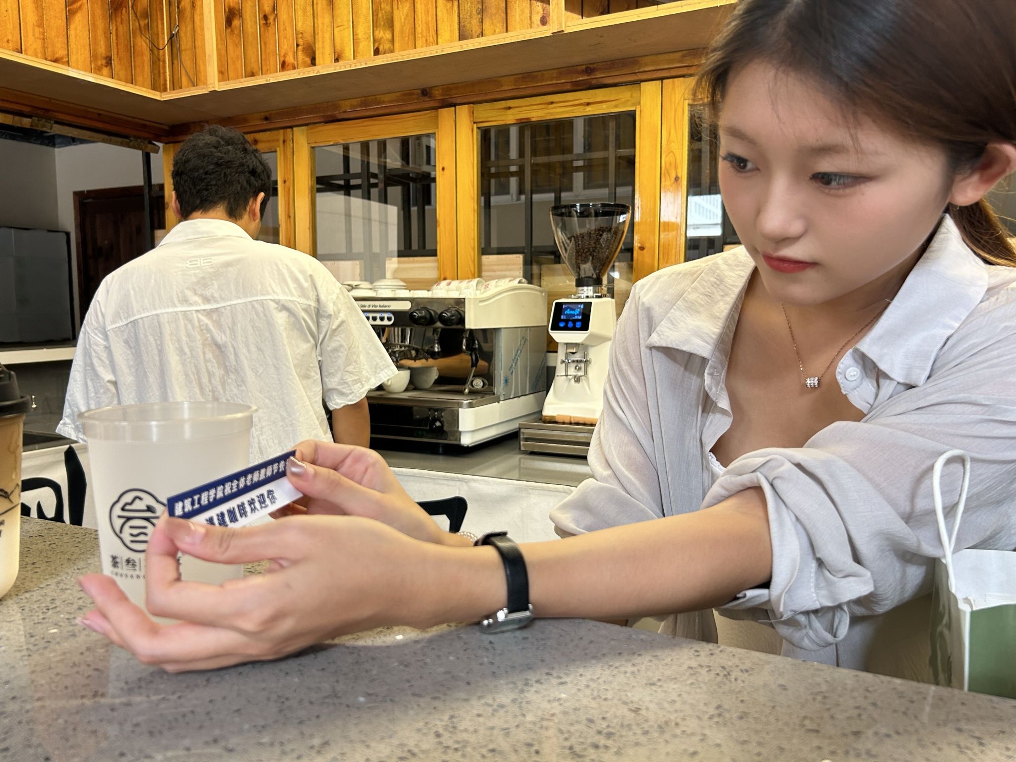 校友余德亮鼓励学弟学妹:“把做咖啡的匠心,用在今后的学习和工作中。”一位老师接过咖啡后笑着说:“这杯咖啡,甜到心里了!”