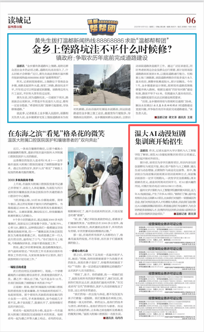 据介绍,该项目为非学历教育项目,培训内容包括创意孵化与视觉开发、核心资产制作与人工精修、镜头生成与动态增强、后期制作与商业化包装等。其中,集训班分为岗前集训班和周末培训班两种方式,岗前集训班即在一定学习周期内,一次性学完全部课程;周末班顾名思义,就是利用周末时间学习。对AI感兴趣的市民,可拨打报名电话18815196111咨询。