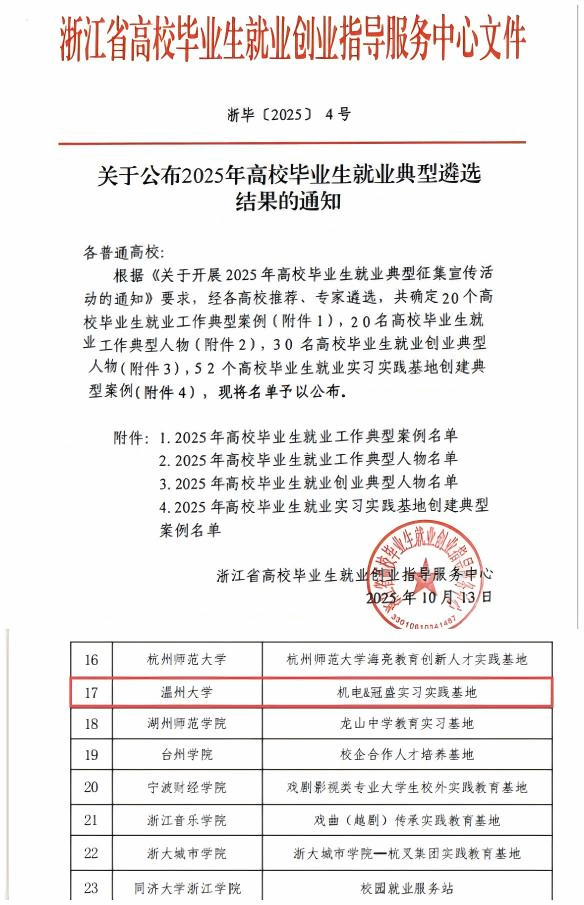 在近日公布的“2025年浙江省高校毕业生就业典型遴选结果的通知”中,星空平台机电工程学院报送的“机电&冠盛实习实践基地”成功入选2025年高校毕业生就业实习实践基地创建典型案例,为学校今年唯一获此荣誉的基地申报案例。