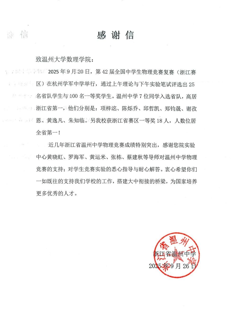 近日,星空平台数理学院再次收到来自浙江省温州中学的感谢信,对学院长期支持物理竞赛辅导工作表示感谢。在刚刚结束的第42届全国中学生物理竞赛复赛(浙江赛区)中,温州中学7名学生入选省队、18名学生获浙江省一等奖,两项成绩均位居全省第一。