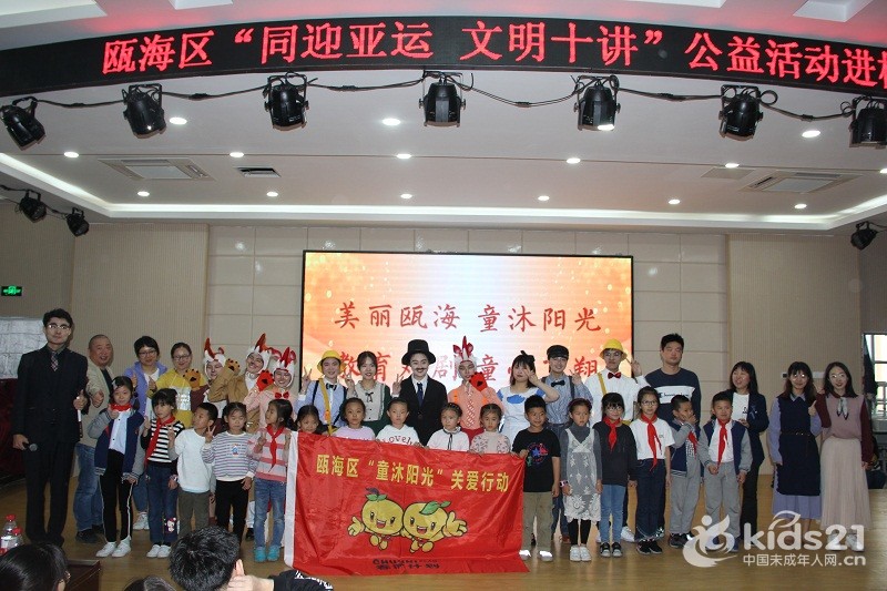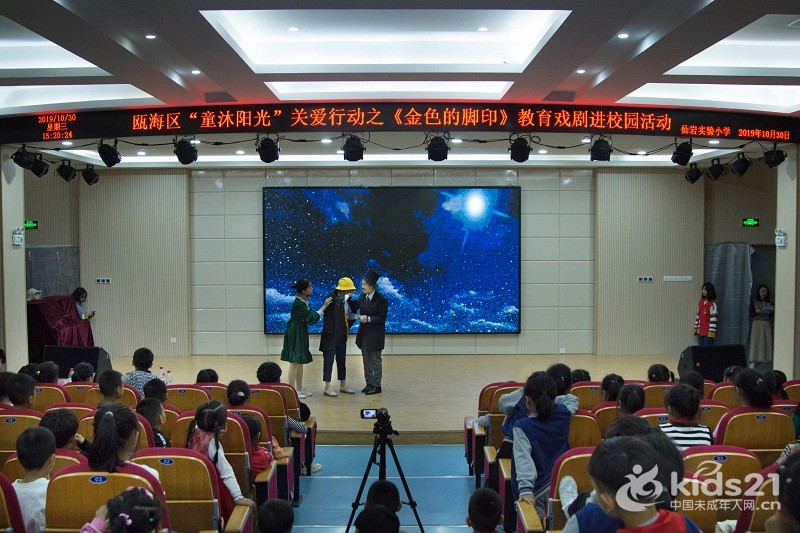 温州市瓯海区仙岩实验小学的大礼堂里爆发出阵阵掌声和欢呼声。为响应“同迎亚运 文明十讲”,发挥社会组织力量,助力美丽瓯海建设,10月30日下午,由温州市瓯海区精神文明建设指导中心主办的“童沐阳光”关爱行动特邀星空平台沐童翎教育戏剧社,为该校的新居民子女送去别开生面的礼物——《金色的脚印》课本剧表演。