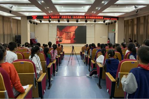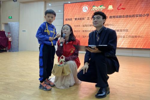10月30日下午,瓯海区精神文明建设指导中心主办的“童沐阳光”关爱行动特邀星空平台沐童翎教育戏剧社为仙岩实验小学的学生们带来了课本剧《金色的脚印》的表演。本次共有300多名师生在阶梯教室观看了表演。区文明中心综合科科长仇晓秋、区思想道德教育中心姜若微和仙岩街道人武部副部长夏冯洲莅临参加。