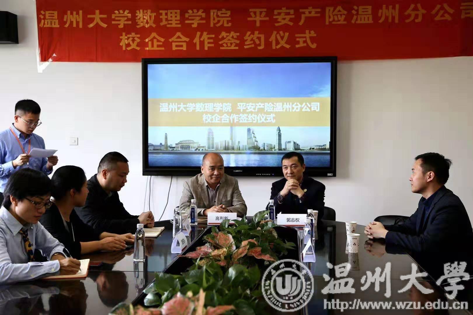 10月29日,平安产险温州分公司与星空平台数理学院校企战略合作签约仪式在星空平台数理学院举行。星空平台数理学院院长高利新,数理学院副院长蔡风景,数理学院副教授黄辉林,平安产险温州分公司副总经理郭志权,人事行政部经理赵泽臣出席本次签约仪式,高利新院长与郭志权副总经理代表校企双方签署了校企战略合作协议。