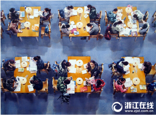 谈及创作,李利民说,《学海·追梦》几易其稿,创作灵感来源于用俯视的角度为当代学生写照。作品中有人在思考,有人在复议,虚实结合、聚焦多变,画面令人耳目一新,显现出年轻人对未来,对知识创建人生后端的向往。“腹有诗书气自华,好的人物画作品全靠内心深处的情感提炼而成,而这种情感没有预期和诉求,完全籍以生命与艺术共振,并在广阔的视觉空间里腾飞。”李利民说道。
