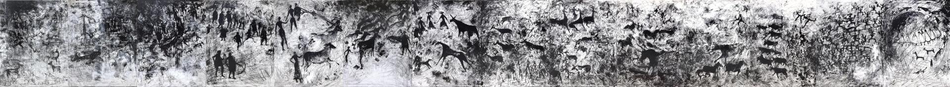据关明新介绍,此次参展的壁画作品,高一米,长十一点四米,采用岩刻和岩绘相结合的绘画形式,以时间轴为创作主线,通过奇趣横生的人物和动物等形象,唤起人们对远古人类生活的意象追溯,作品富含浓烈而又诗意的视觉效果和艺术感染力。“《文明的印痕——人类的迁徙》这组作品能成功入选第十三届全国美展作品展览,感到十分荣幸,也是对自己多年来潜心创作的一次肯定和鼓励。”作为中国美术家协会会员、中国陶艺家协会会员、中国壁画家协会会员,多年来关明新一直深耕艺术创作和青瓷文化研究。这组壁画作品也是关明新第二次入选全国美展。