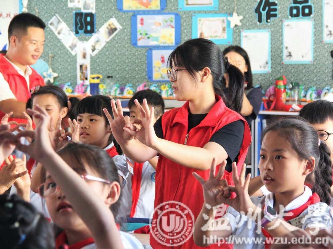 学院志愿者们利用新青年下乡的形式走进乐清市南岳镇小学,讲诉新中国成立的风雨历程,教授歌曲《国家》及手语操,浇灌爱国之种,托起梦想之帆。爱国主义教育如同一场春雨浸润了孩子们的心灵,小小课堂引导着孩子们笃志好学,将小小少年梦融入祖国大梦,同时也进一步激发了志愿者的爱国奉献热情。