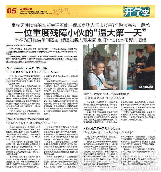 温大学生工作部部长张敏表示,根据国家的政策,学校按规定录取了李新。考虑到他的特殊情况,学校尽可能提供相应的帮助。