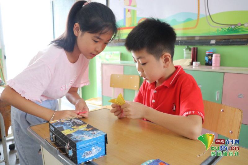 图为小朋友们相互帮助折纸上遇到的困难。中国青年网通讯员 印江杰 摄