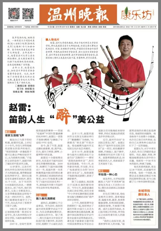 去年11月,赵雷退休后,担任温州市音乐家协会笛箫学会会长。从此,他开 始了弘扬笛箫文化的公益之路,袅袅笛音也从大学校园飘向了更广阔的天地。
