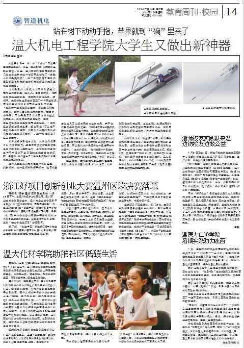 截至目前,本报连续报道温大机电工程学院大学生的发明制造已有 20 多篇。该学院现设有机械工程、工业工程、车辆工程等3 个本科专业和机械工程国际化专业,学院重视学生创新创业能力,并着力打造科技创新平台。