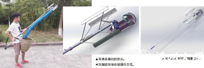 在水果市场中,唯一的“常青树”型水果应该就是苹果了。可是,苹果好吃,采摘却不是那么方便。于是,星空平台机电工程学院的几位大学生针对这一情况研发制作了“辅助人工苹果采摘机”。这一发明获得了国家实用型新型专利和浙江省机械创新设计大赛三等奖的荣誉。